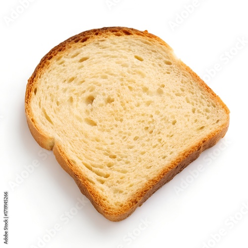 Single slice of white bread with golden-brown crust and airy texture on white background