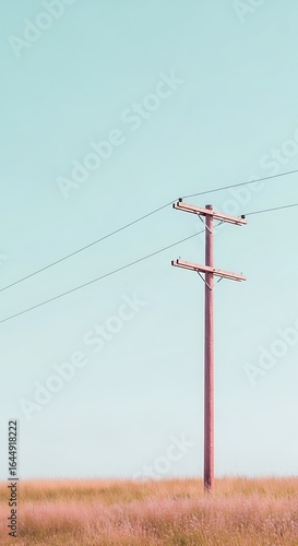 Single telegraph pole in a vast grassy field under a pastel sky evoking solitude and rural tranquility with minimalistic composition