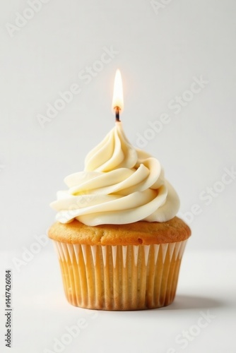 Single vanilla cupcake with lit candle, white background, food, tasty, white