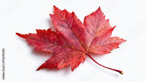 Single vibrant red maple leaf with intricate vein details on a clean white background