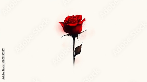 rose, red, flower, single, bloom, floral, white, background, stem, vibrant, blossom, isolated, beauty, elegant, nature, art, flora, plant, love, romance, botanical, design, minimalist, bright, close, studio, light, center, sharpened, artwork, delicate, graceful, purity, valentine, drawing, nobody, detail, shadow, leaf, simple, romantic, presentation, space
