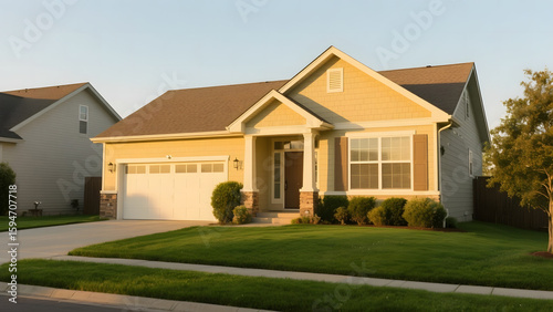 house, residential, garage, window, roof, lawn, suburban, neighbourhood, driveway, sidewalk, shrubbery, evening light, two-story, exterior, architecture, facades