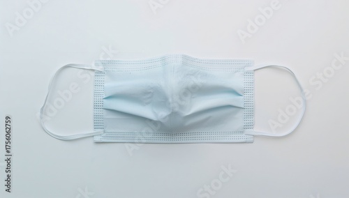 Single-use medical mask on a plain white surface, texture detail, healthcare, blue, medical use