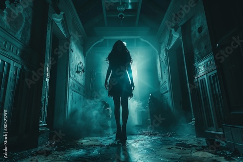 Sinister image showcasing a woman's silhouette in a hauntingly lit corridor with a foggy atmosphere