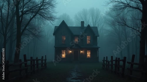 Sinister wooden house in a dense foggy forest, dim candlelight flickering inside, old rotting fence surrounding it, ominous atmosphere, perfect horror setting