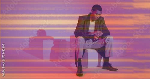 wristwatch, man, sitting, formal, studio, cube, white, african american, minimalist, contemporary, elegance, professionalism, lighting, mood, geometric, block, coloured, ambient, gradient, purple, orange, blazer, t-shirt, slack, contemplative, hand, leaning, looking, smooth, floor, seamless, wall, shadow, line, clean, polish, single, prop, horizontal, colours, male, adult, fashion, casual attire, interior