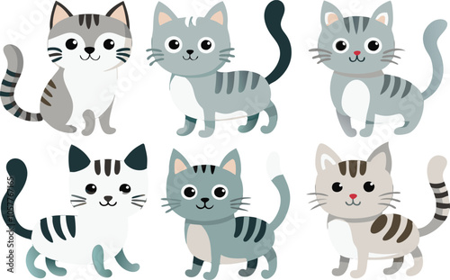 cat, cartoon, cute, adorable, grey, white, fur, striped, tail, pose, face, looking, viewer, background, illustration, animal, pet, felino, domestic, kitten, cat, meow, purr, playful, happy, smiling, friendly, fluffy, soft, sweet, charming, lovely, graphic, design, art, digital, vector, clip art, icon, character, mascot, collection, set