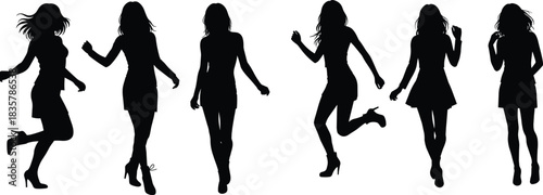 silhouette, woman, woman, female, person, people, black, white, background, isolated, standing, posing, dancing, walking, running, jumping, fashion, style, elegant, graceful, movement, dynamic, active, playful, happy, joy, freedom, celebration, party, event, social, group, collection, set, vector, graphic, illustration, art, design, shape, form, figure, body, leg, shoe, heel