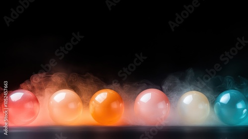 Six colorful and reflective spheres rest on a surface, surrounded by a subtle fog, creating an atmospheric scene with a captivating play of light and color.