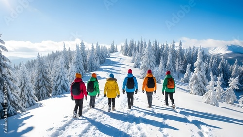 winter, snow, hiking, group, forest, tree, colourful, adventure, outdoors, mountain, sunny, bright, cold, season, travel, recreation, nature, landscape, trekking, backpack, jacket, exploration, activity, friends, journey, blue, sky, scenic