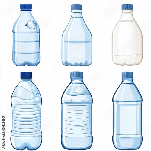 bottle, water, plastic, liquid, transparent, clear, container, beverage, drink, refreshment, hydratation, cardboard box, design, shape, size, volume, full, empty, blue, cap, lid, top, reusing, recyclable, eco, environment, clean, pure, fresh, healthy, cool, summer, illustration, graphic, vector, isolated, white, background, collection, set, various, different, type, style, object, image, disposable