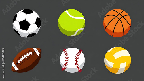 6, different, sport, ball, arranged, 2, row, soccer, tennis, basketball, football, baseball, volleyball, round, game, equipment, athletic, competition, recreation, activity, collection, set, graphic, illustration, flat, simple, clean, white, black, green
