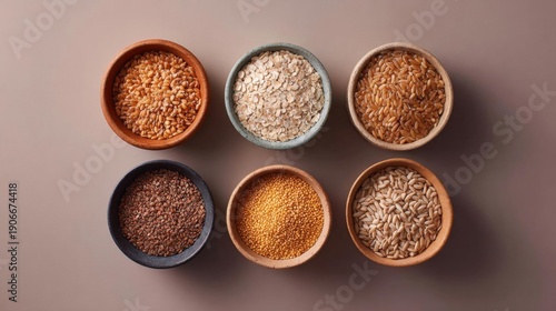 Six small bowls of different types of grains arranged in a row on a beige background. the bowls are made of clay or terracotta and are of different sizes and shapes.