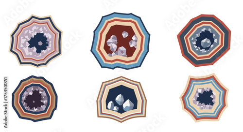 crochet, geode, coaster, hand-made, craft, bricolage, textile, fiber, art, design, pattern, crystal, gemstone, mineral, insert, home, decor, table, surface, protection, round, circular, shape, colourful, vibrant, many-coloured, striped, layer, center, detail, unique, set, collection, group, arrangement, topview, overhead, isolated, white background, studio shot, closeup, macro, texture, soft, warm, cosy, kitchen, dining
