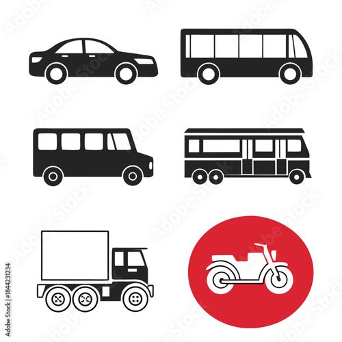 Six Vehicle Silhouettes with Red Circle Accent on White Background Keywords car, truck, bus