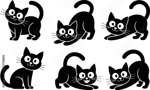 black, cat, cat, felino, kitten, animal, pet, illustration, drawing, vignetting, cartoon, whimsical, playful, cute, adorable, big, eye, wide, stretching, sitting, crouching, standing, curious, energetic, domestic, art, graphic, vector, stylised, simple