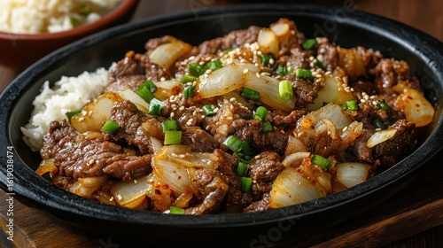 beef, onion, rice, sesame, cooking, food, meal, hot plate, cookery, delicious, savoury, dinner, asian, ingredient, culinary, eatery, epicure, preparation, favor, garnish, protein, tasty, nourishment, presentation, heat, lunch, dining, fresh, aroma, texture, plate, spice, chef, eating, vibrant, serving, comfort food, sizzling, appetising, traditional, alimentary, dinnerware, eatery, dish, hot, colourful