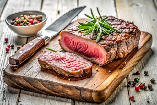 steak, food photography, chopping board, wooden board, knife, white background, hi-res, beef, steakhouse, meat, protein, high-quality, appetising, tasty, delicious, epicure, butcher