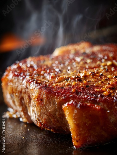 Sizzling Steak with Golden Crust on Hot Surface Captured in Macro Photography