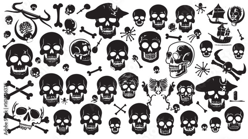 Skeletons. Large set of skulls, bones and pirate symbols , black silhouettes isolated on white background