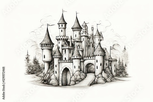 building exterior, church, built structure, architecture, hand-painted, spirituality, calligraphy, digital artwork, illustrated, creativity, monochrome, building, isolated, line art, outdoors, ancient, cartoon, drawing, graphic, history, castle, vignetting, drawn, fairy, tower, white, hand, tale, tree, art, day, old, sky, illustration
