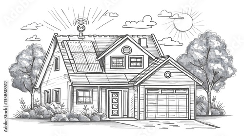 house, home, modern, vignetting, drawing, illustration, environmentally friendly, solar, panel, sustainable, energy, design, architecture, real, estate, property, residential, building, graphic, contemporary, charming, inviting, sunny, tree, garden, landscaping, nature, art, plan, concept, style, hand, drawn, line, greenery, environmentally, friendly, exterior, front, view