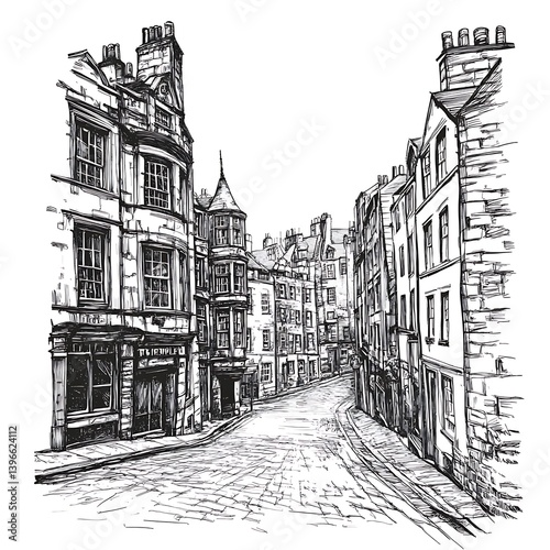 street, city, old, town, building, house, architecture, cobbled, lane, alley, vintage, historic, vignetting, drawing, illustration, urban, travel, europa, england, scotland, stone, window, door, roof, chimney, detail, perspective, black, white, monochrome, line, art, design, graphic, scenery, landscape, pathway, road