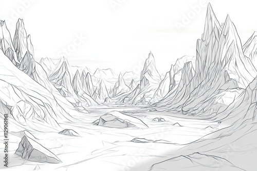 mountain, landscape, vignetting, drawing, rocky, peak, vale, hill, jagged, ridge, cliff, crag, rock, stone, boulder, scenery, vista, view, terrain, wilderness, nature, art, illustration, white, black, line, outline, abstract, graphic, design, digital, image, style, texture, pattern, detail, perspective, depth, space, environment, cold, desolate, serene