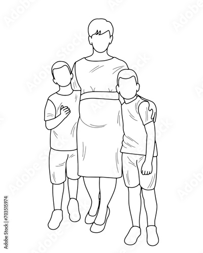 Sketch silhouette of a pregnant mother hugging her two sons, maternal feelings, isolated vector