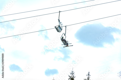 Ski chair lift at the ski resort above the clouds.