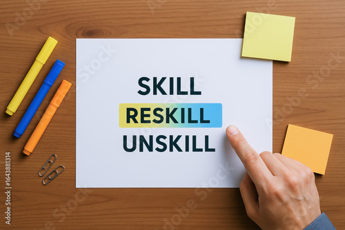 Skill reskill unskill concept on white paper with colorful markers and sticky notes on wooden table, hand pointing at paper for learning and development motivation