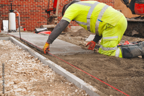 Skilled builder laying concrete paving slabs on sand and cement mix for new pathway