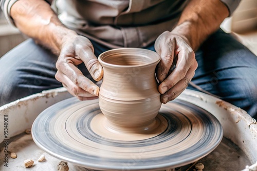 Skilled Hands Shaping Clay on a Pottery Wheel. A close-up shot of a craftsman's weathered hands carefully working a piece of clay on a spinning pottery wheel.