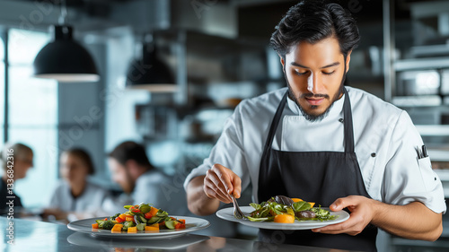 chef, male, kitchen, epicure, plating, black hair, beard, culinary, modern, eatery, food, professional, cooking, vegetable, presentation, cookery, dining, meal, fresh, ingredient, creativity, artistry, teamwork, hospitality, culinary arts, food preparation, kitchen equipment, favor, seasonal, healthy, vibrant, colourful, dish, fine dining, food industry