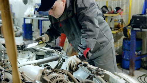 car, mechanic, engine, repair, auto, garage, maintenance, service, inspection, automotive, flashlight, workshop, technician, examining, checking, job, profession, men at work, skilled, labor, vehicle, automobile, fixing, problem, diagnostic, troubleshooting, industry, mechanical, work, hood, tool, equipment, professional, concentration, sharpened, expertise, precision, detail, care, broken, damage, solution, analysing, illuminated, dark, inside, working, overall, uniform, safety