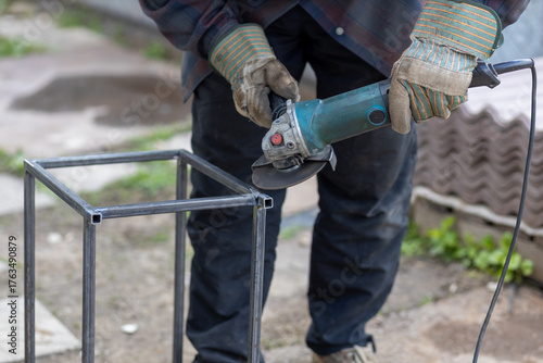 Skilled worker using an angle grinder to cut metal frame in an outdoor workshop, showcasing craftsmanship and attention to detail in metalworking process