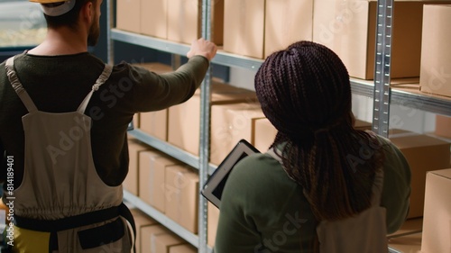 Skillful staff members preparing warehouse orders for delivery, using laptop and tablet to verify shipping informations, crosschecking online data with stock labels in storage establishment