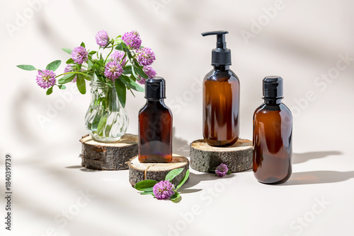 Skin care products in amber bottles next to pink clover flowers on a beige background. The concept of natural cosmetics