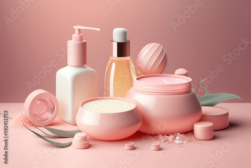 Skin care products on pink background. Beauty products, spa. Ai generated