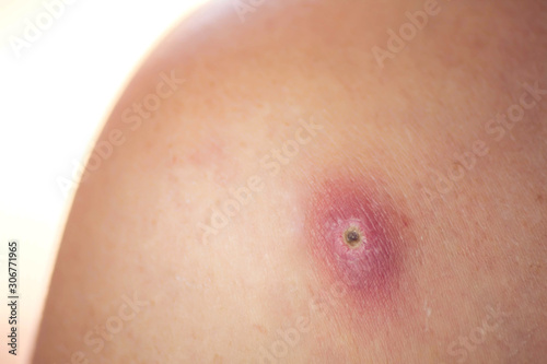 Skin of woman with big and painfull furuncle. Medicine and skincare concept