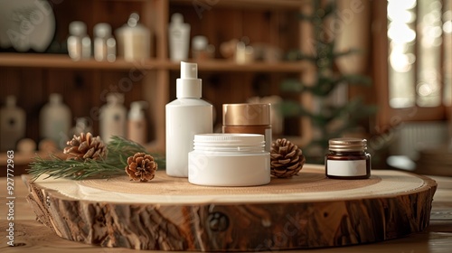skincare products is elegantly displayed on a wooden slab, adorned with pinecones and evergreen sprigs