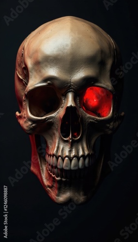 Skulls in dark brown and black with red highlights, bold, rugged, skull