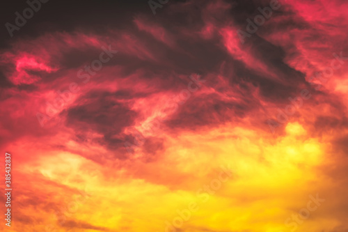 sky and clouds nature background, abstract sky, red pink and orange yellow color in blurry soft clouds in overcast sky, burn sky