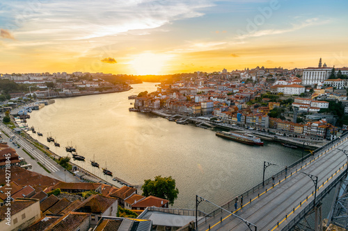 Skyline of the historic city of Porto with bridge by sunset, Portugal