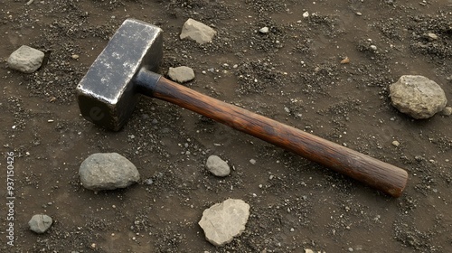 sledgehammer, hammer, tool, construction, building, work, industry, heavy, metal, wood, handle, ground, dirt, gravel, stone, rock, construction site, worksite, labor, effort, power, strength, force, demolition, destroy, breaking, concrete, stone, debris, rough, textured, gritty, dirty, dusty, closeup, macro, detail, background, texture, pattern