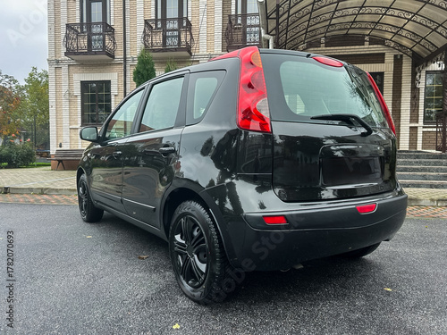Sleek black compact car parked elegantly in front of a stylish building during a cloudy afternoon