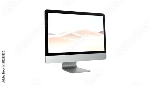 computer, desktop, screen, display, monitor, technology, electronic, device, contraption, modern, sleek, aluminium, silver, metal, workspace, office, digital, computing, hardware, tech, sand, desert, landscape, wallpaper, background, isolated, black, white, beige, tan, neutral, minimalistic, simple, clean, elegant, professional, design, presentation, business, studio, object, still, life, stationary, information, system, peripheral