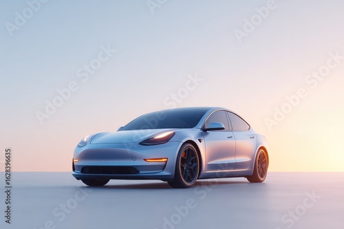 Sleek electric car parked on minimalistic background during suns