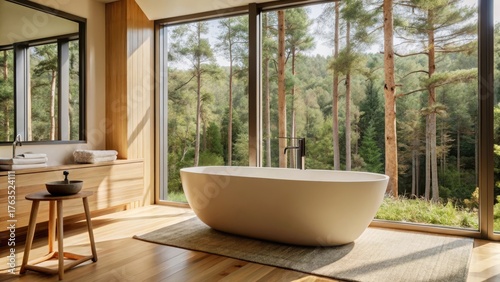 Sleek modern bathtub in minimalist bathroom with forest view and large windows for natural light