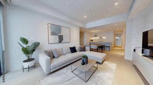 Sleek modern living room design with neutral tones and minimalistic decor in a stylish apartment setting